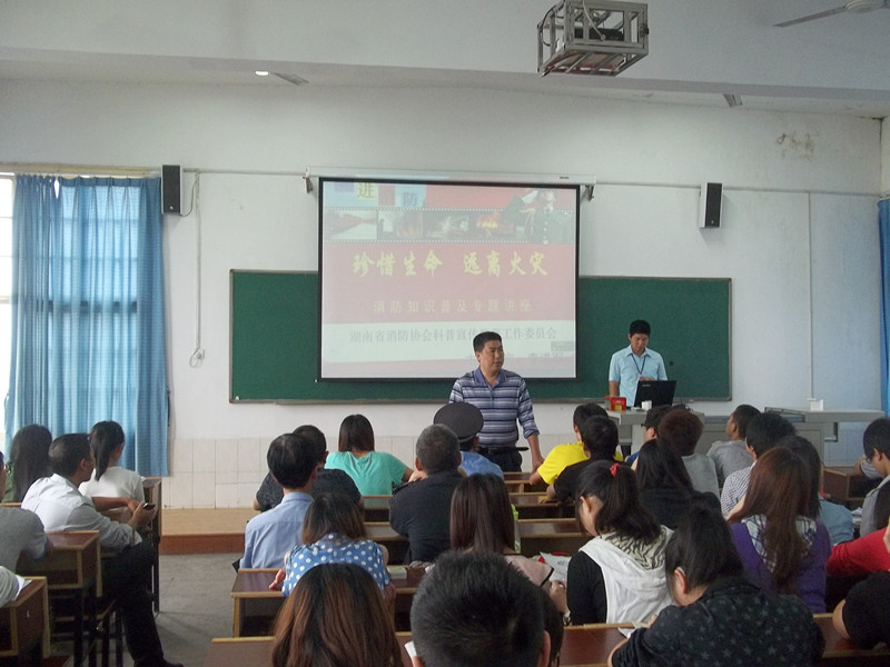船山学院党委书记肖基毅老师、党委副书记邹正生老师,党委副书记唐康伟老师,船山学院学工部部长李庆老师,保卫处副处长吴成丰,消防科科长龚高龙,保卫科科长谢有的,船山学院新校区学工办负责人李海涛老师及船山学院全体辅导员老师与新校区各班学生代表一同参与了此次会议。本次消防安全知识专题讲座由湖南省消防协会科普宣传教育工作委员会主任教务员李进军教官主讲。