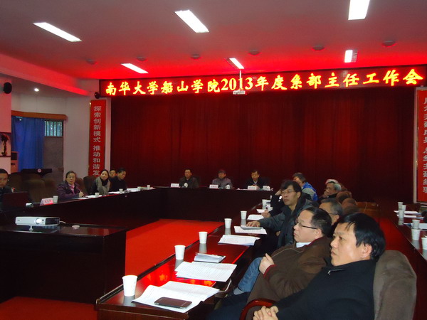 上午,南华大学西苑办公楼视频会议室,窗外寒风阵阵,室内却暖意融融。船山学院在这里隆重召开2013年度系部主任工作会议。南华大学校长文格波教授、副校长龚学余教授、副校长阳小华教授莅临会场指导。南华大学副校长兼船山学院董事长龚学余教授主持会议。船山学院领导班子全体成员,“五系一部一中心”负责人、各科室负责人出席会议。