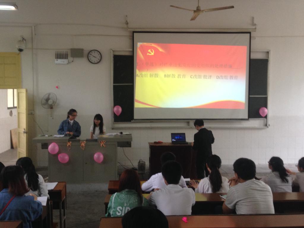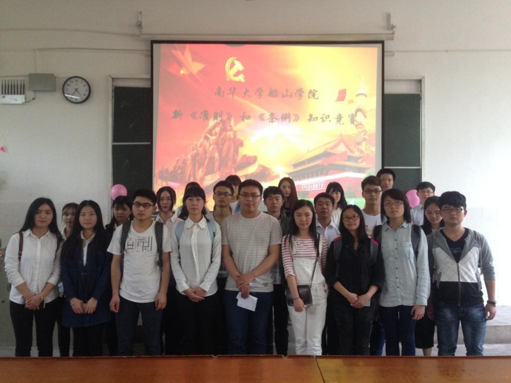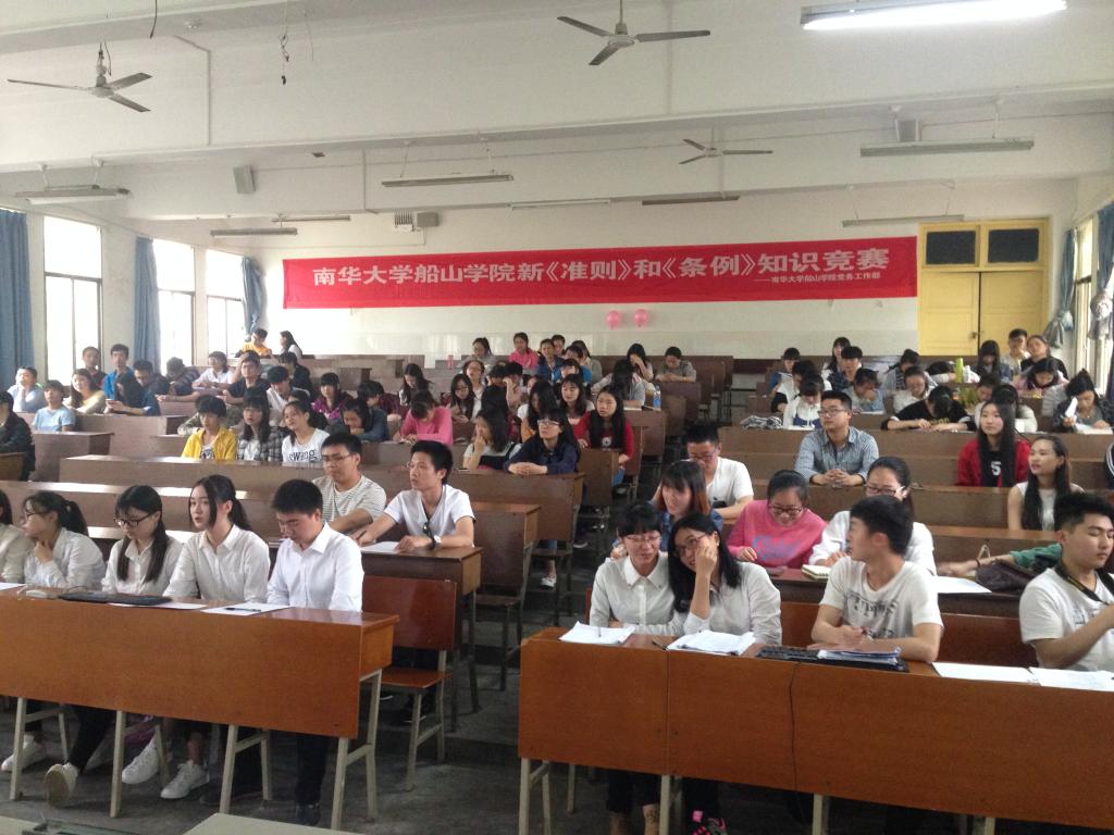 4月28日下午,船山学院新《准则》和《条例》知识竞赛在南华大学红湘校区二教225教室举行。院党务工作部工作人员、党员、预备党员、入党积极分子观看比赛。各年级代表队参加本次比赛。