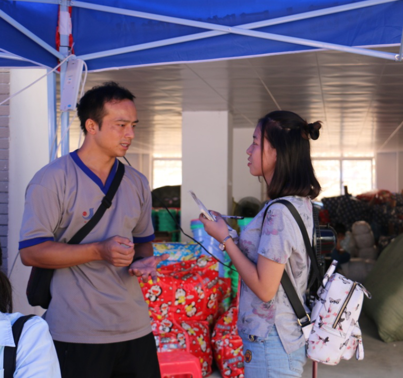 孙越龙老师,院团委常务副书记,宿舍生活用品发放组负责人。炎炎烈日,两天辛苦的迎新工作并没有减退孙越龙老师迎接新生的热情,他高兴地说:“能让新同学感受到我们的热情,在心里留下良好的印象,是我们应该做的事情。”