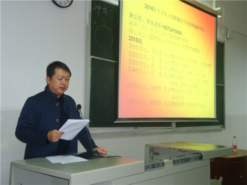 为夯实党建基础,认真贯彻落实党的十八届六中全会精神及南华大学第三次党代会精神,加强学生入党积极分子的党性意识,深化党的基本理论、基本路线和基本纲领的教育,11月24日晚上,船山学院分党校在红湘校区2教学楼225教室举行了2016年下半年入党积极分子培训班开班典礼仪式。船山学院党委书记、分党校校长阳剑兰、党委副书记邹正生以及各学生党支部书记和辅导员老师出席了开班仪式。会议由党委副书记邹正生主持。