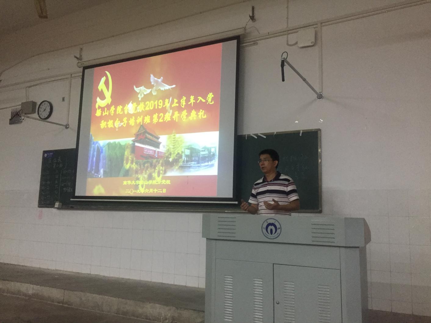 开学仪式在庄严雄伟的国歌中拉开帷幕。首先由江娴老师宣读本次学习培训的有关制度和编班情况。接着阳剑兰老师作动员讲话,他指出入党积极分子参加集中学习培训是加入党组织的必要条件和要求,对各位学员表示热烈的祝贺。同时,阳剑兰老师对学员提出希望与要求:一是要深刻理解和把握培训的意义和目的。要通过系统的党的知识培训学习,深刻领会习近平新时代中国特色社会主义思想,了解党的性质、纲领、宗旨、组织原则和纪律,懂得党员的义务和权利,端正入党动机,坚定为共产主义事业奋斗终身的信念。二是要以良好的态度和学风参加本次培训。重点解决好培训态度的问题,做到学习动机纯正,学习态度端正;要高度珍惜培训学习机会,要把参加这次专门的培训作为一次思想认识、理论水平和政治素质提高的机会;要遵守培训纪律,严格按照培训的要求完成各项学习任务。
