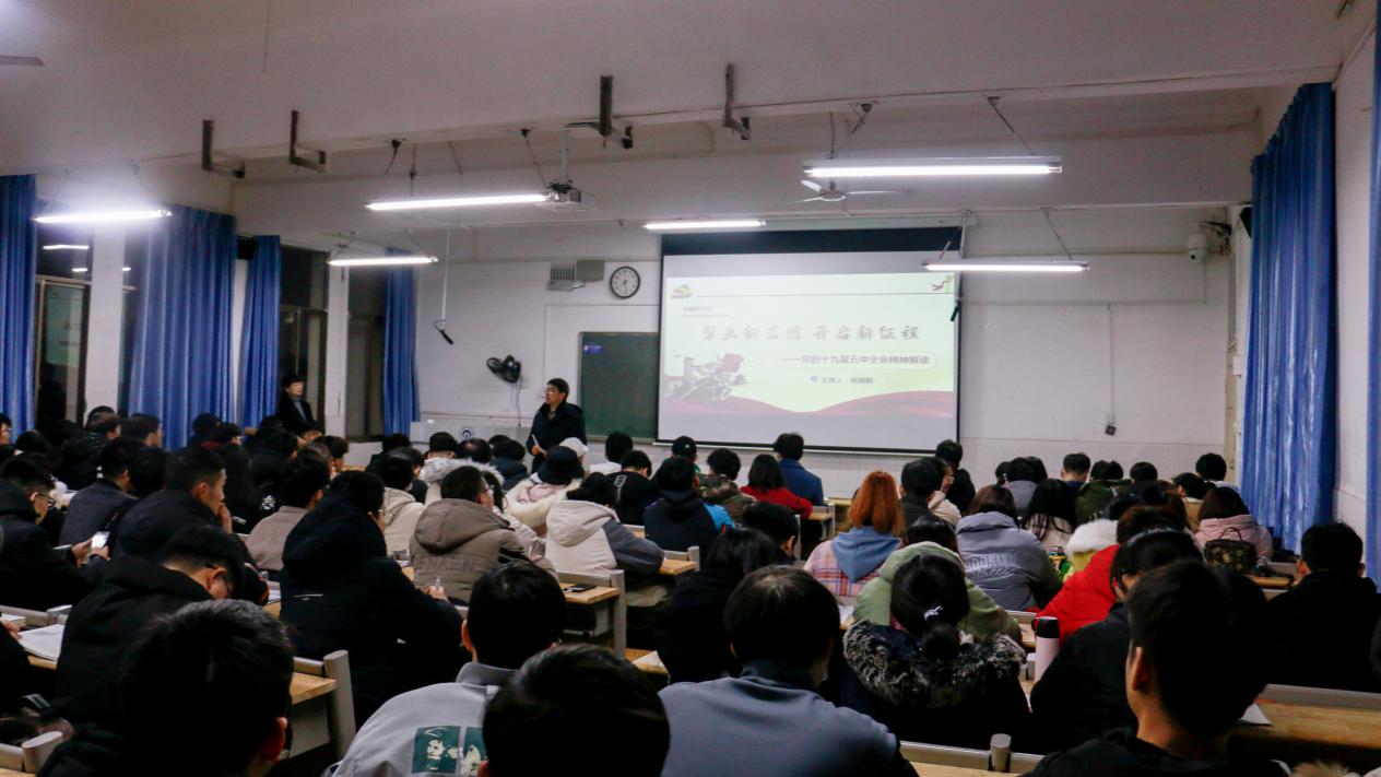 为进一步深入学习贯彻党的十九届五中全会精神,1月6日晚,船山学院与化学化工学院联合举办的“党的十九届五中全会精神解读”报告会在核学楼307召开,此次报告会邀请了南华大学副校长何旭娟进行授课,会议由船山学院党委书记阳剑兰主持,两个学院教职工党员和学生党员一并参加。
