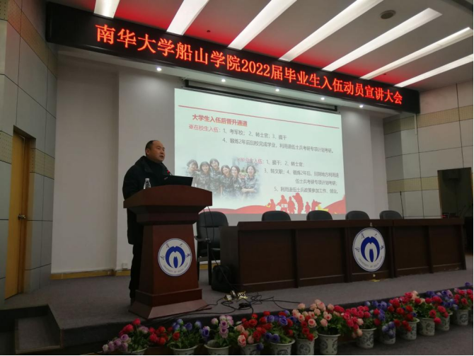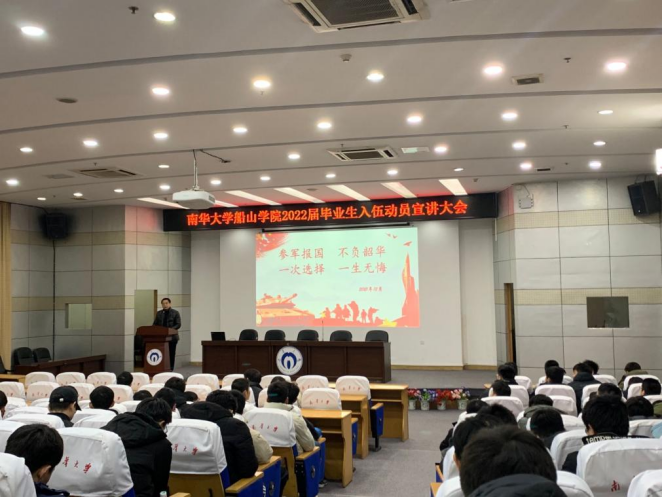 为深入贯彻习近平总书记有关做好高校毕业生就业工作重要指示精神,推动我院毕业生顺利毕业并高质量就业。2021年12月27日晚上七点半,我院2022届毕业生入伍动员宣讲大会在图书馆学术报告厅召开。太阳集团tyc151招生就业办主任何鹏老师、校武装部汪先利老师、船山学院征兵专干何霖老师、毕业年级辅导员范婷老师以及毕业年级全体男生出席此次大会。本次会议由何鹏主持。