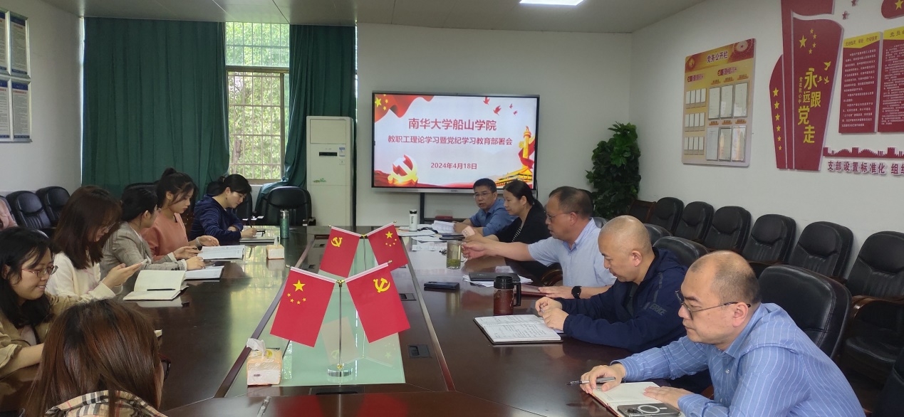 阳剑兰传达学习了习近平总书记关于党纪学习教育的重要讲话和重要指示批示精神、《中共中央办公厅关于在全党开展党纪学习教育的通知》以及湖南省委《关于在全省开展党纪学习教育的工作方案》,传达《南华大学党纪学习教育实施方案》,结合学院实际作出党纪学习教育具体工作部署。