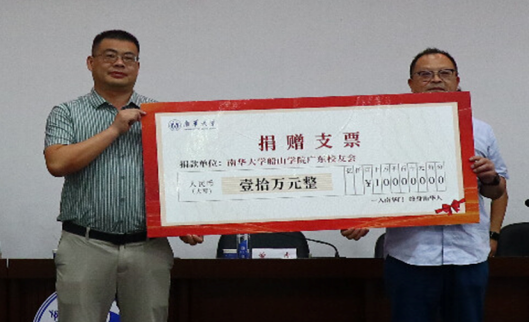 曾虎校友(左)代表广东校友会向船山学院捐赠10万元奖学金