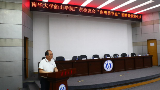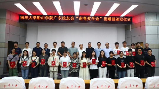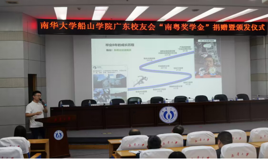 在阵阵掌声中,广州祺晋建设有限公司总经理、2004级土木专业毕业生曾虎校友代表广东校友会向学院捐赠10万元的奖学金,这份慷慨捐赠不仅承载着校友对母校的情谊,更是为莘莘学子树立了一个前行的目标。随后,南华大学教育发展与校友联络办公室主任李先国老师宣读表彰决定,与会校友和老师为获奖个人和团体颁发了“南粤奖学金”获奖证书。