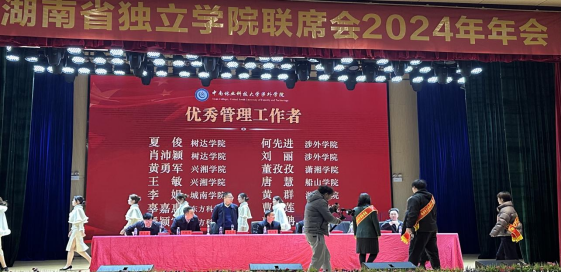 1月9日至11日,湖南省独立学院联席会2024年年会在中南林业科技大学涉外学院召开。湖南省教育厅民办教育处处长黄仕军、有关高校校领导、董事长及全省各独立学院院长、党委书记等近百余人参加会议。我院院长曾庆生、院党委书记阳剑兰、副院长廖迎春及获奖教师等人参会。