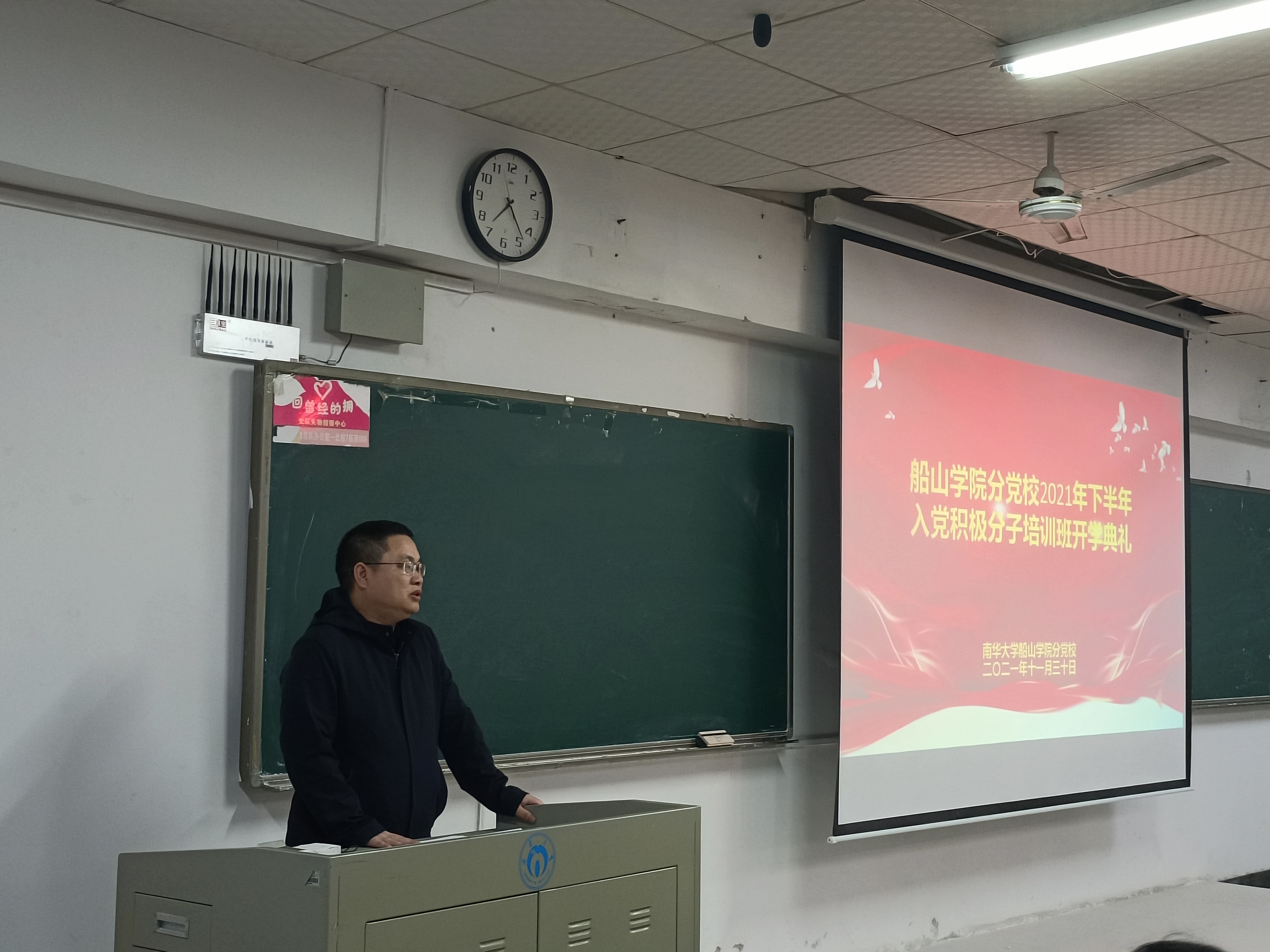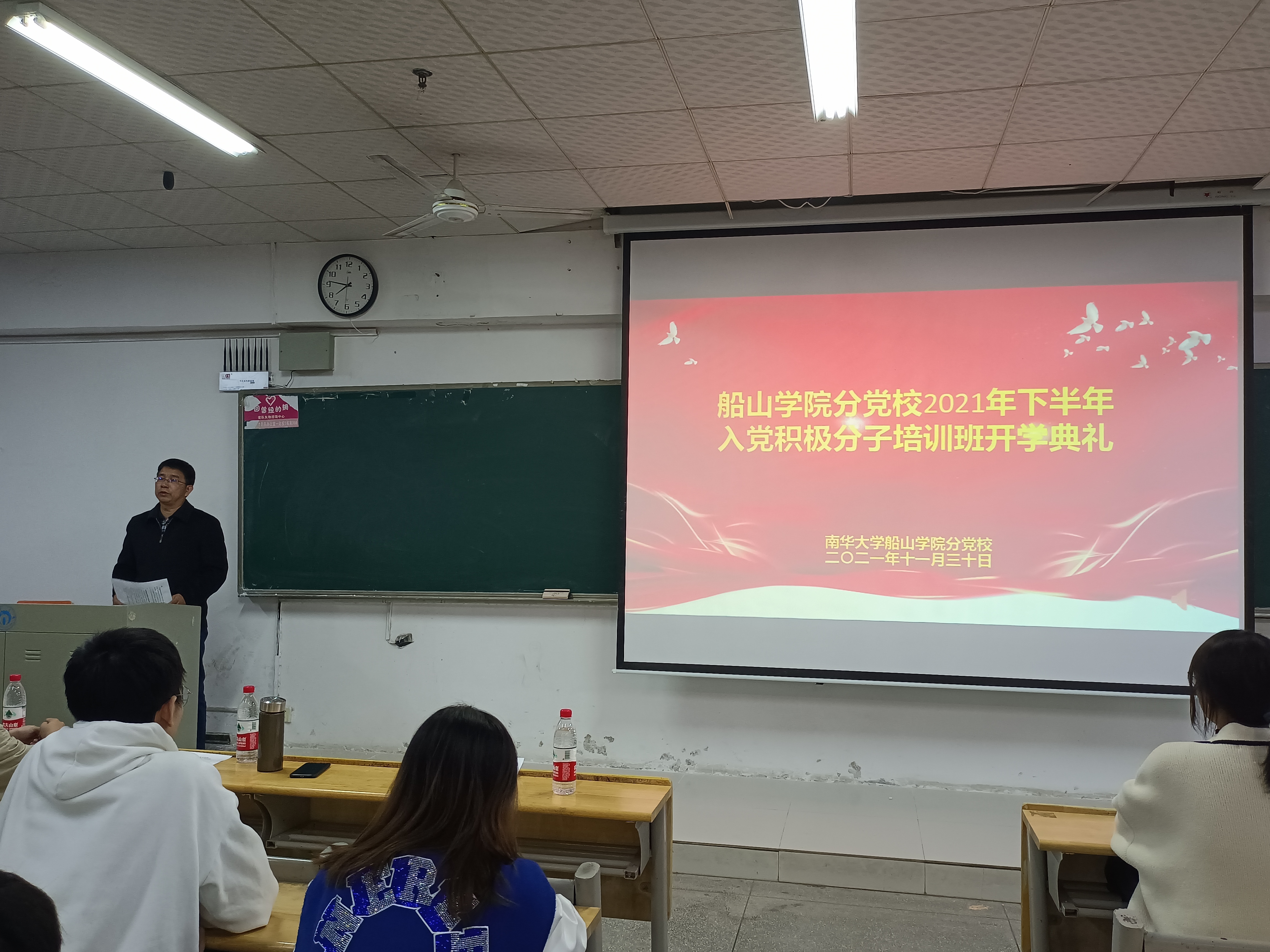 11月30日晚,船山学院分党校在红湘校区南华楼311教室举行2021年秋季学期入党积极分子培训班开班典礼。船山学院党委书记、分党校校长阳剑兰老师、院党委副书记刘期彪老师,学生党支部书记周英老师和江娴老师出席开班仪式。仪式由刘期彪副书记主持。