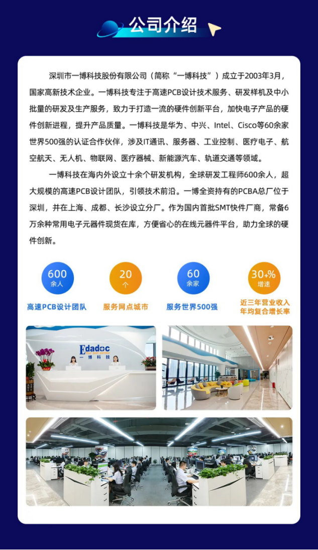 作为全球高速PCB设计的领军企业一博科技致力于向客户提供高速PCB设计、SI仿真分析、PI仿真、EMC设计、PCB生产焊接加工物料提供一站式硬件创新解决方案,提升产品品质,缩短客户研发周期。