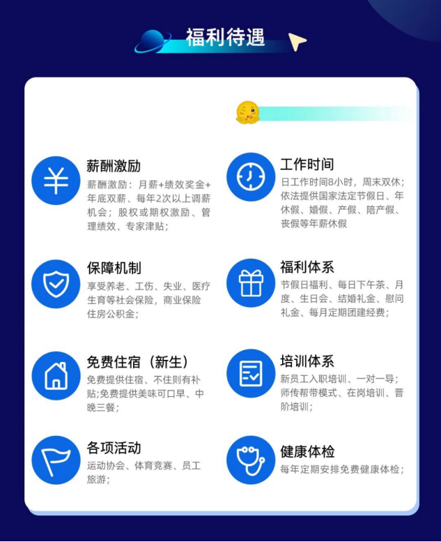 福利体系:五险一金、健康体检、员工宿舍、节假日福利、每日下午茶、月度生日会、结婚礼金、慰问礼金、每月定期团建经费