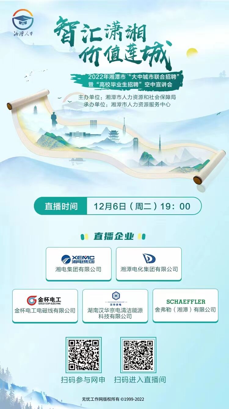招聘企业:湘电集团有限公司、湘潭电化集团有限公司、金杯电工电磁线有限公司、湖南汉华京电清洁能源科技有限公司、舍弗勒(湘潭)有限公司。