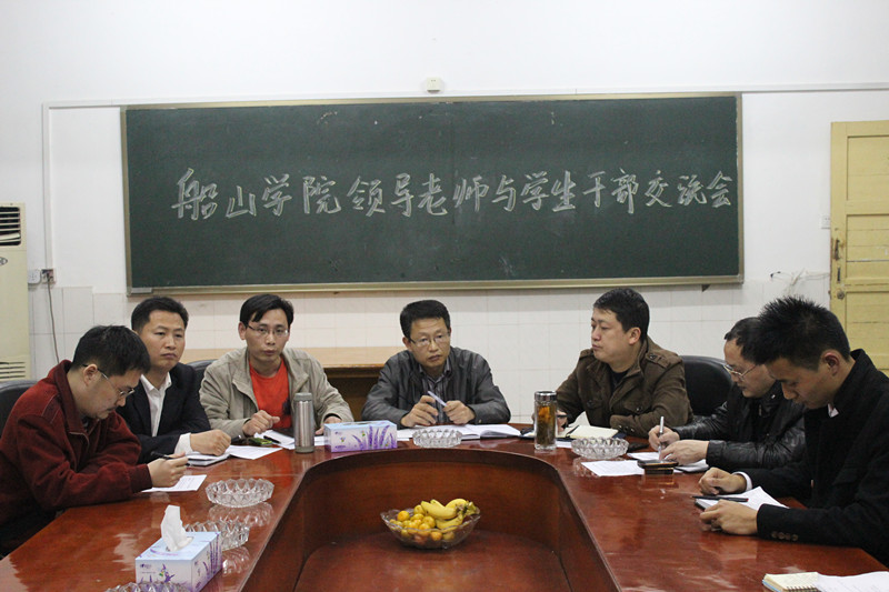 交流会在学生干部的自由发言中拉开序幕。大家紧紧围绕学风建设、心理健康教育、社会实践和校园文化建设等方面提出了自己的建议。各位老师也分别提出了富有建设性的措施。最后,邹正生老师语重心长的对学生干部们说,恢弘志士之气,不宜妄自菲薄,我们要有充分的自信去面对学习和生活;我们要从同学们的需求、兴趣、爱好入手,利用各种新方法、新平台,引领形成一股积极向上的好学之风;我们要创造性的开展工作,继承和发扬“船山精神”,积极打造船山文化品牌。
