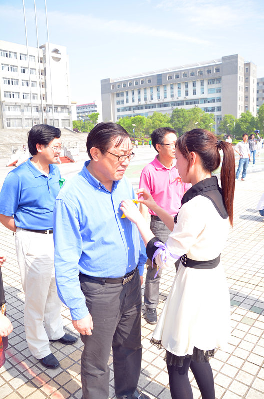 船山学院的同学为邹书记系上彩色的丝带