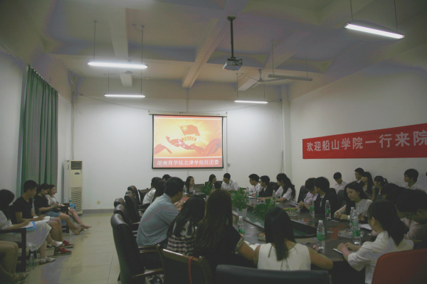30日下午一点,船山学院院学生会主席李进、院团委副书记尹焰谕携船山学院主要学生干部抵达湖南商学院北津学院,并受到以湖南商学院北津学院院学生会主席刘焱为代表的主要干部的热烈欢迎。下午三点,两院团委、学生会在湖南商学院北校区图书馆会议室召开首次见面会,双方在和谐欢乐的环境下,进行了初步的会晤与了解。见面会后,船山学院主要学生干部在北津学院学生会主席刘焱、北津学院团委副书记胡博斯的带领下,参观了北津学院校园。