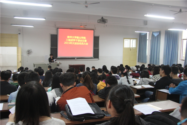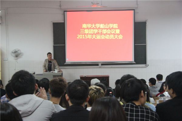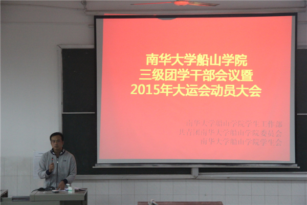 10月29日中午,船山学院三级团学干部会议暨2015年南华大学运动会动员大会在南华大学第二教学楼225教室顺利召开。出席本次会议的有船山学院党委副书记唐康伟老师、院学生科科长兼院团委书记李庆老师、2011级学工室负责人李海涛老师、2012级学工室负责人李国华老师、2013级学工室负责人李双龙老师、2014级学工室负责人彭国文老师、院团委常务副书记孙越龙老师、院团委常务副书记王小椒老师。本次会议由李庆老师主持。