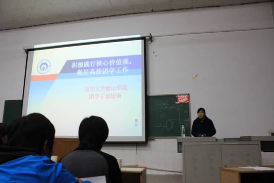 随后,谢铷鸿书记给我院2015级团学干部上了一堂精彩的培训课,她深入浅出地讲解了作为当代大学生如何积极践行社会主义核心价值观,让同学们清楚地明白当代思想的多元,作为学生干部必须传播正确的思想,并要求学生干部不仅要以身作则,树立勤学、修德、明辨、笃实的人生态度,加强自身品德修养,更要引领同学们树立积极向上的人生观,价值观,在人生方向中做出正确的抉择。同时,她也希望学生干部从同学们的根本利益出发,以服务同学健康快乐生活为主旨,乐于奉献,更要在面对紧急情况时,保持沉稳。