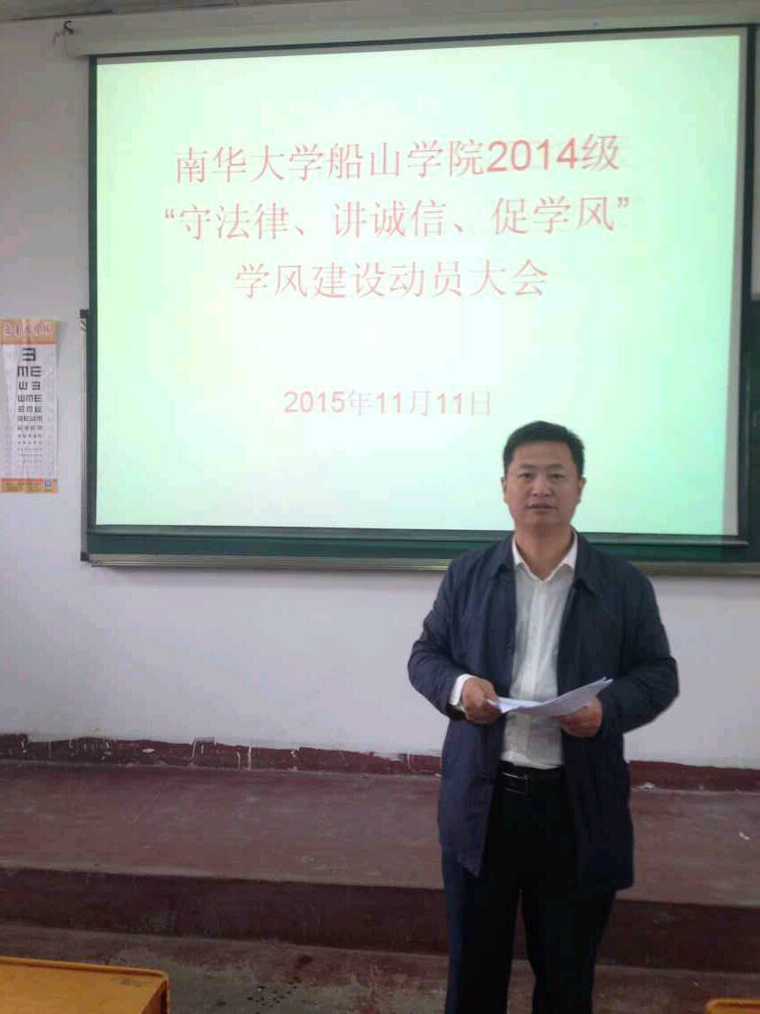 2015年11月18日,太阳集团tyc1512014级学风建设动员大会在南华大学红湘校区第二教学楼225教室顺利召开。船山学院2014级学工办主任彭国文老师主持本次会议,2014级土木专业全体人员参与本次会议。会议内容主要以守法律、讲诚信、促新风为核心。