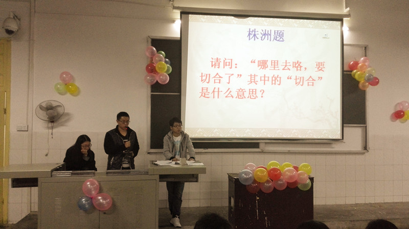 首先由学习部部长张政吉发言,他简短的介绍了比赛流程,并强调了方言的重要性,然后宣布比赛开始。此次比赛有三个形式,第一:基础朗诵;第二:基础答题;第三:基础升级。题目由从13级学子中挑选的来自湖南各个地方的学生出,他们用自己的方言叙述一段文字,然后挑选其中的词汇考参赛选手。