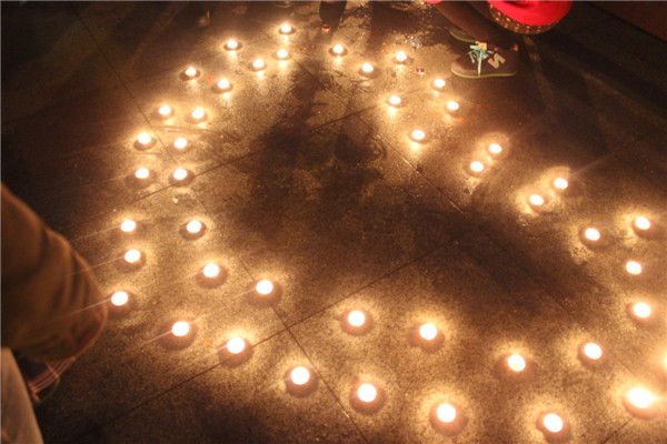 当晚小雨淅沥,寒风阵阵,可同学们却依旧冒着雨,顶着寒风在黑夜中点燃蜡烛进行哀悼活动,蜡烛一次次的被风吹灭,大家又一次次燃起,不畏寒风围成圈阻挡寒风,只为让烛火燃得更旺,让我们的祝福与悼念可以传得更远。蜡烛被摆成心形,烛火将黑夜照亮,在主持人轻轻念读悼念词后,哀悼三分钟开始了,大家都手捧蜡烛,诚心默哀。默哀结束,活动也进入尾声。