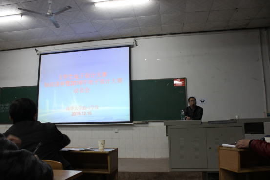 2015年12月16日晚7:00,船山学院在南华大学雨母校区二教104教室召开了大学生电子设计大赛知识讲座。南华大学电气工程学院副院长王彦教授、船山学院副院长何啸峰副教授、船山学院综合科陈代娣副教授及雨母校区负责团学工作的周英老师出席了本次大会。