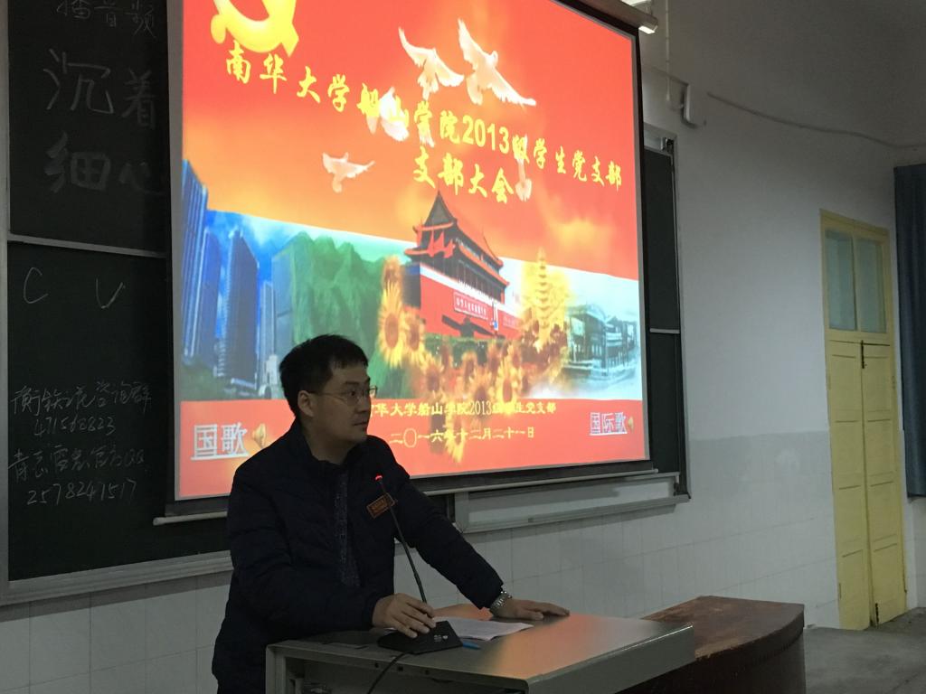 2016年12月21日晚上7:30,太阳集团tyc1512013级学生党支部在南华大学红湘校区第二教学楼225召开支部大会暨2013级学生党员、团学干部会议。此次大会主要对2016年12月份新发展对象进行不记名投票表决,及期末诚信考试、圣诞节严禁外出和毕业生电子摄像等相关工作进行安排;本次大会由2013级党支部书记李海涛老师主持,2013级辅导员肖维华老师、何鹏老师和张力老师出席了本次支部大会。