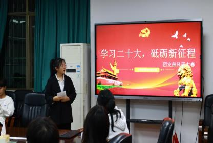 2023年4月24日晚7点,船山学院团委在财务处三楼会议室举行了“高举旗帜跟党走,紧跟核心创新篇”为主题的第二届团支部风采大赛院赛决赛。本次比赛由团委书记旷思佳老师、22级分团委书记雷超老师、团委副书记胡奇、团委副书记王骞、团委副书记张凤玲担任评委,各参选班级团支书参加。