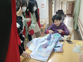 志愿者们与老人们进行亲切的交流,与老人们一起做手工,共同编织一副世界地图的手工技艺品,还陪伴他们一起做了其他如玩益智小游戏、打太极、唱歌、康复舞蹈等多种活动,丰富他们的养老休闲生活。