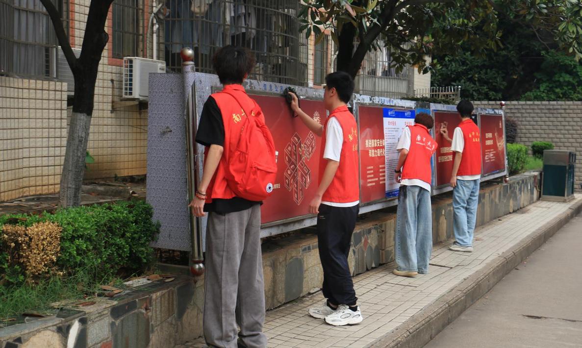 活动中,志愿者分工协作,热情投入,清扫宿舍楼、食堂垃圾,捡拾绿化带杂物,清除教学楼厕所小广告和烟头,归置电动车,擦拭公告栏等。校园在他们努力下愈发整洁舒适,“小事筑大美” 理念悄然传递。