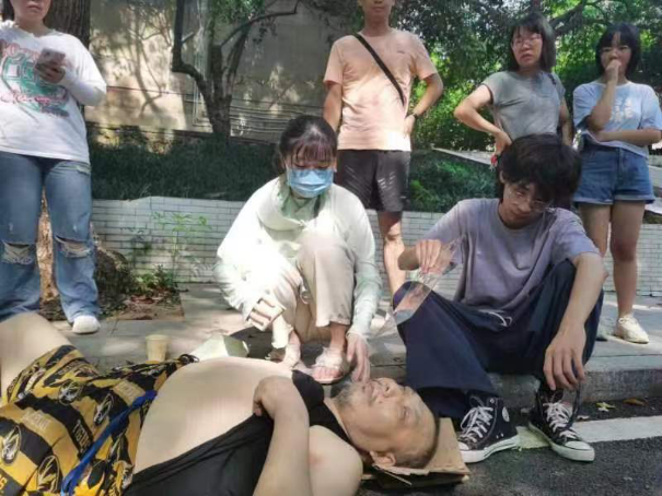 他们先把老人放平,然后用附件的纸盒将老人头部支撑起来为老人遮阴扇风去暑,附近的一位阿姨带来了两杯水。此时胡㻰璇正在咨询老人一些问题,这个时候老人已经开始翻白眼了,她便接过阿姨给的两杯水,先是将老人的上衣掀起,然后用手将第一杯水洒在老人身上。而后趁着他还有一些意识慢慢的将第二杯水喂给他喝。为了让老人清醒一些,苏琼庶等人便给老人扇风,之后还有机械学院的刘军老师也来帮助老人。直到救护车来临几人便合力将老人送上了救护车。