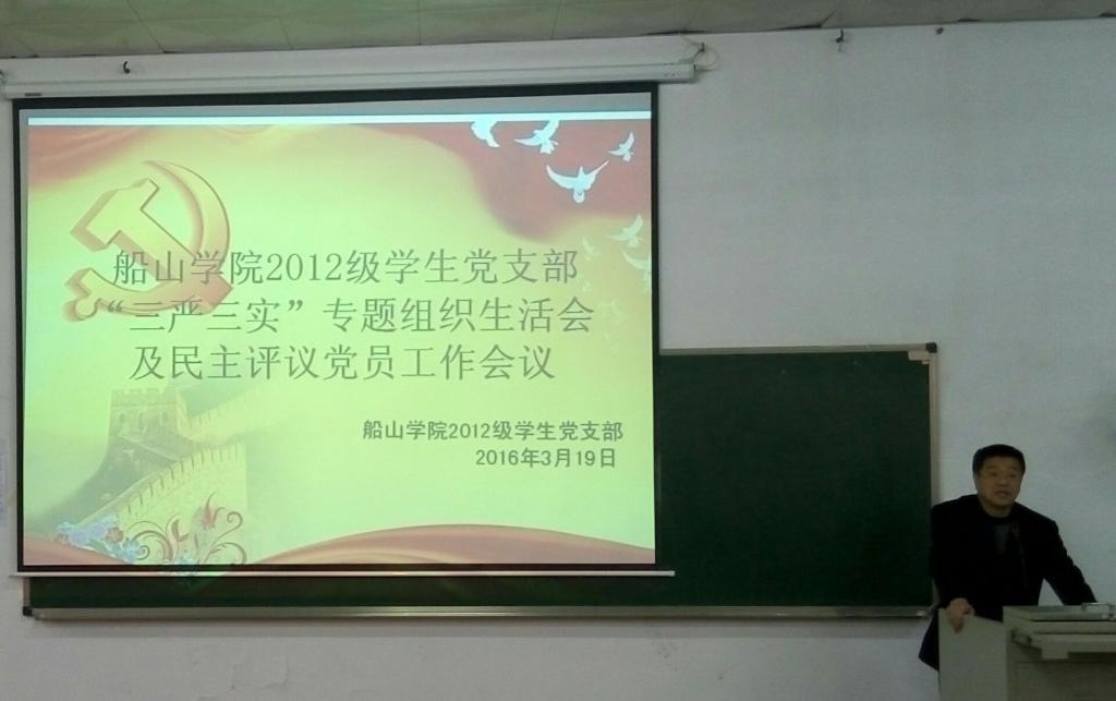 2016年3月19日上午9点,太阳集团tyc1512012级学生党支部在二教101教室召开“三严三实”专题组织生活会及民主评议党员大会。船山学院党委副书记唐康伟老师、院学生科负责人李庆老师、2012级学生党支部书记李国华老师、党支部副书记魏宏老师及褚书来老师、王鹏老师出席了此次会议。全体学生党员、预备党员参加了此次会议。会议由李国华老师主持。