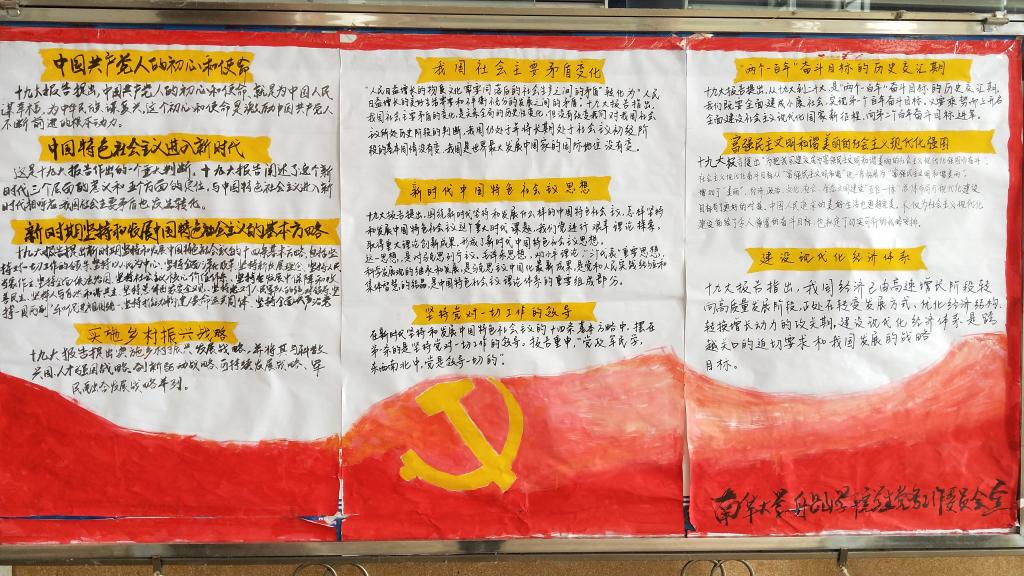希望通过此次专栏展示,同学们可以更全面深刻地了解党的十九大,能很好的贯彻党的十九大精神,不忘初心,始终保持奋发图强,攻坚克难的精神状态,为自己的梦想而不懈奋斗。