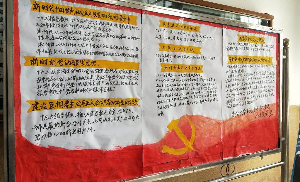 为深入贯彻党的十九大精神,使其深入人心,船山学院学生党工委于在二教大厅内设立“十九大”宣传栏。我们的专题宣传对十九大会议精神进行了重点概括,简单明了,引人入目。