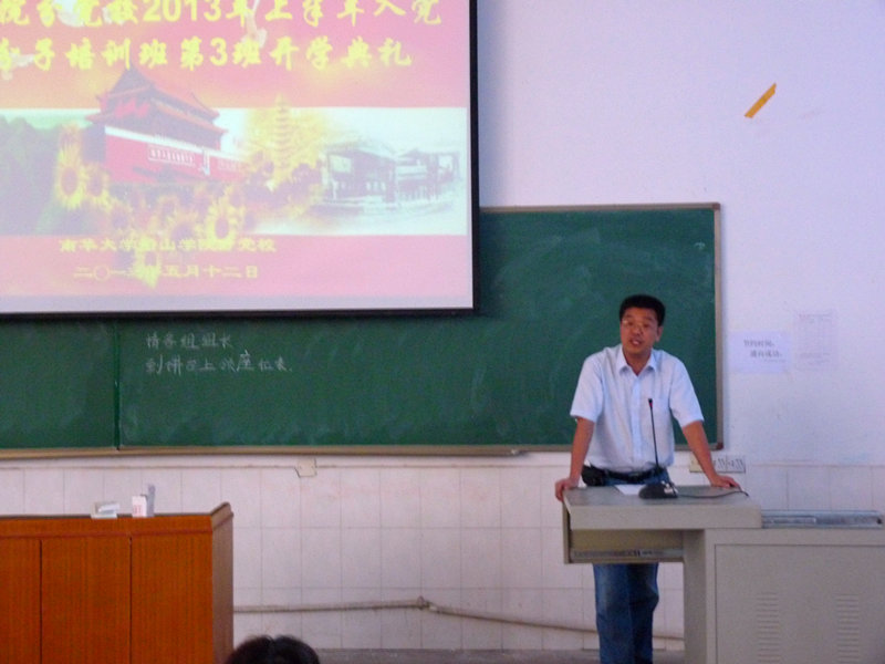 5月12日,2013年上半年太阳集团tyc151分党校入党积极分子培训班第3班开学典礼在雨母校区N2-204教室举行。船山学院党委副书记唐康伟老师、船山学院学工部部长李庆老师、雨母校区学工办负责人、学生第七党支部支部书记李翠新老师及全体辅导员出席典礼。